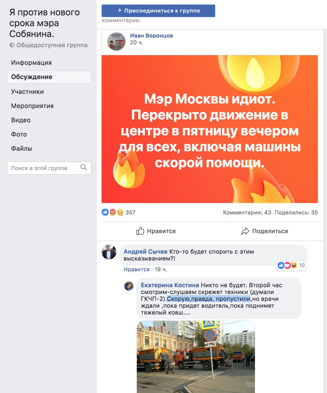 П.С. Там в том же посте в комментариях милые люди предлагают поджечь мэрию. Сразу два человека призывают поджечь мэрию, у одного из комментаторов на странице размещены посты с исторической справкой почему хорошо, что Москву сожгли при Наполеоне. Сразу видно, персонажи не очень адекватные, с навязчивыми идеями, пропустите уже скорую к ним домой! -> https://www.facebook.com/groups/SobianinNet/permalink/1792341800887814/?comment_id=1792496480872346
