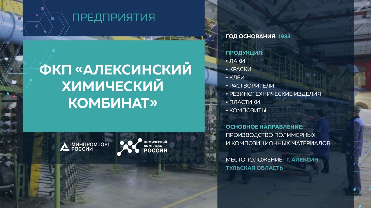 Федеральное казённое предприятие «Алексинский химический комбинат» основано в 1933 году. Завод специализируется на выпуске полимерных и композиционных материалов.