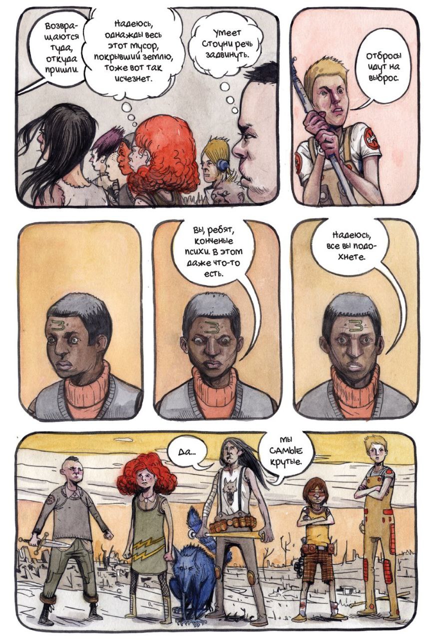 Пиздюки харизматичные и запоминающиеся [спасибо рисунку], они бухают, жрут наркоту, но всячески оттягивают взросление, дабы их не сожрали "мраковики". Эдакий антуражик "Повелителя мух", только значительно веселее. В комикс-шопах стоит за твёрдую обложку и 300+ страниц буквально 450р [шо ебать как дёшево для графроманчика], так что даже не фанатам – на книжной полке во славу разнообразия смотрится збс)