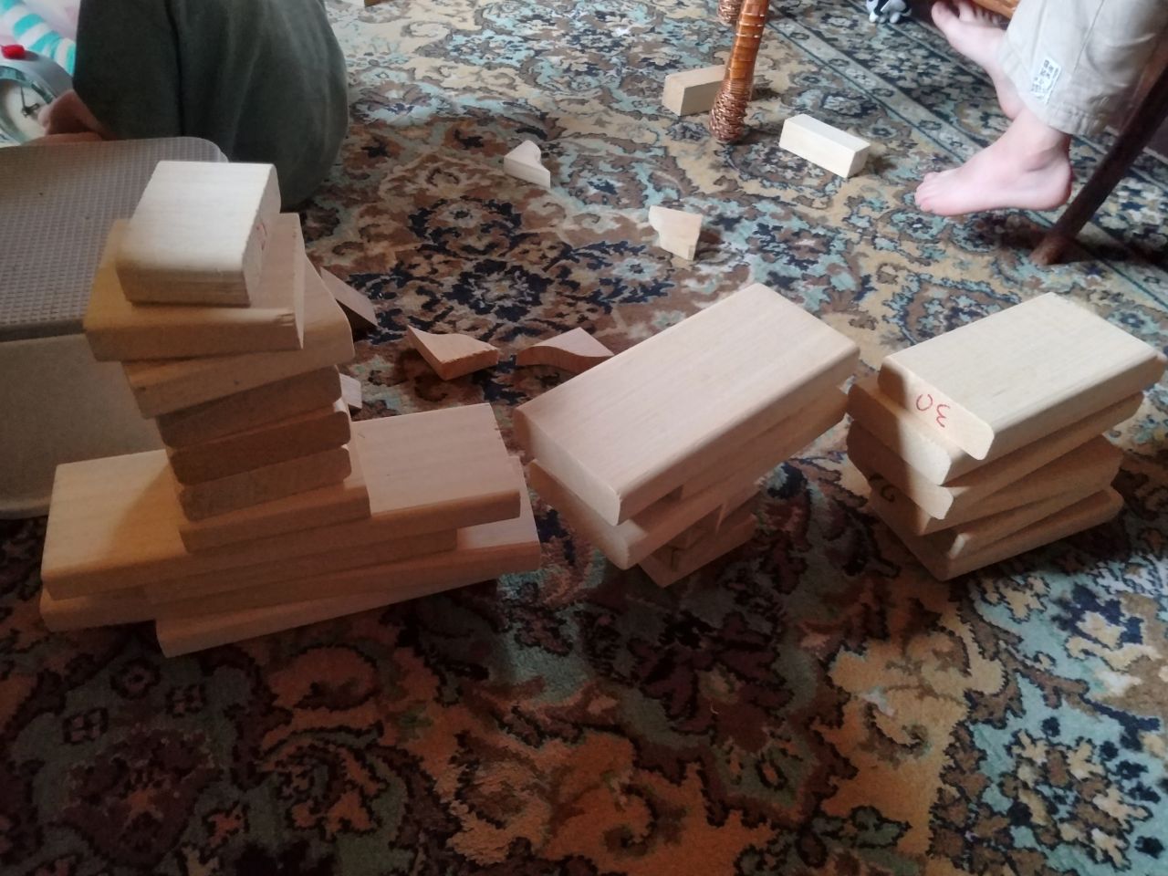 Вытащили все дощечки, что у нас есть, разложили по четырем кучкам. Сначала по одинаковым (везде по 7). Потом переложили произвольным образом, начали решать.
