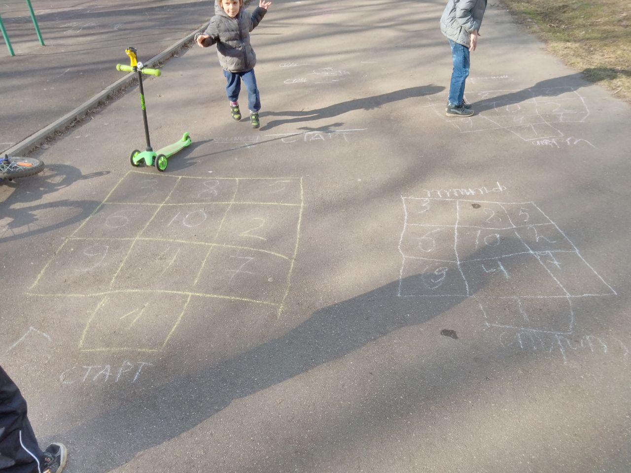 Сегодня мы долго гуляли. Когда ребятам надоели велосипеды-самокаты, я заметила, что они интересуются классиками. И тогда я нарисовала им классики своего детства. Не совсем, конечно, допридумала.
