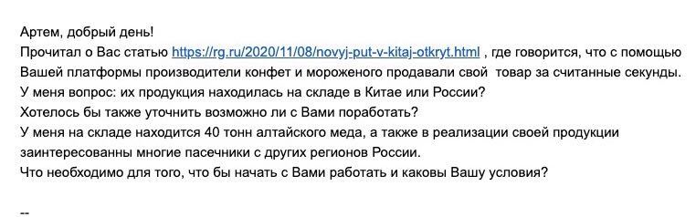 Но даже прочитав весьма адекватную статью, которая и стала первоисточником всех этих новостей, человек все равно написал мне такое письмо. Из которого можно узнать, что на МОЕЙ платформе наши товары продаются за считанные секунды!🤦♂️ А ведь я всего лишь дал комментарий от лица нашего агентства. Статья здесь https://news.1rj.ru/str/chinabiz/946