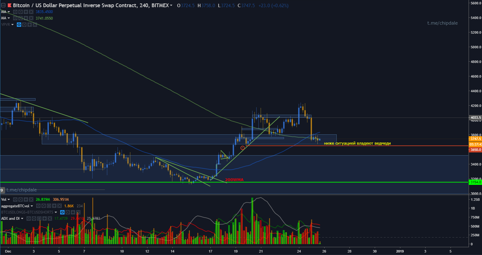 Чип пока не паникует 😎 Быки пытаются удержаться выше 200-го мувинга на H4 и проторговать правое плечо перевёрнутой H&S. При закрытии дня ниже 3650 шансы рогатых тают, как мороженое в полуденной Сахаре 🍦🌞 Я свои лонги, взятые на отбитии от 200WMA держу. Из плюсов, если удержимся и поедем наверх, то сделаем это без балласта лонгистов с х10.