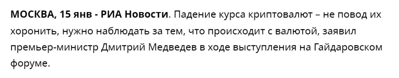 ⚡️⚡️АТТЕНСЬОН! ⚡️⚡️ Дмитрий Медведев, премьер-министр РФ, предлагает не хоронить крипту :) Что-то за неделю уже третья новость из России в поддержку криптовалют. До этого была странная новость про лектора РАНХиГС, потом уже про ректора той же академии тов. Мау, а теперь второе лицо в государстве по сути топит за крипту. WTF ❓
