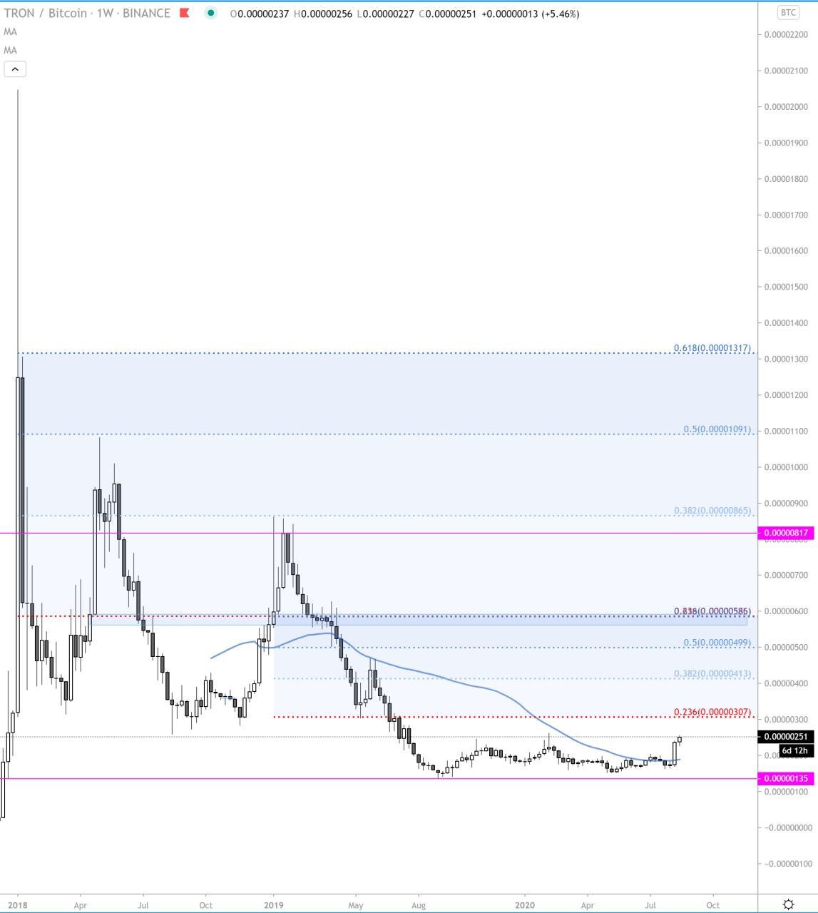 Основную цель в 585 сат вижу на совпадении зон 0.236 фибы от ATH до низов 2019 года и 0.618 фибы от последнего хая, это ещё +130% от текущих 🚀🚀🚀