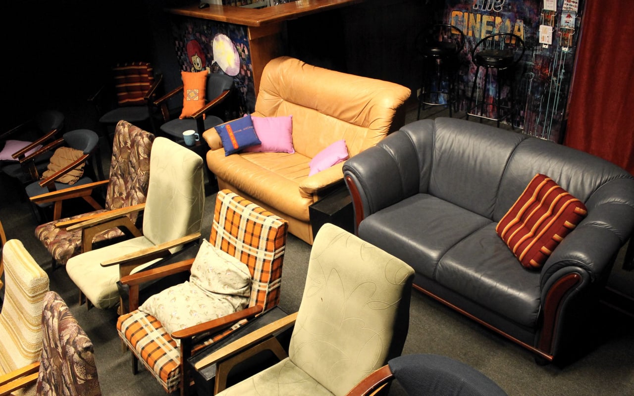 Не помню, кто именно показал мне этот кинотеатр (скорее всего моя постоянная питерская муза Саша В.), но он моментально стал моим любимым, и я регулярно ходила туда в первые годы жизни в Северной столице. Афиша там была чудесная: показывали артхаусные фильмы, фестивальное и даже немое кино с взаправдашним живым тапёром, часто даже с пояснительными и вступительными словами! Билеты стоили в районе смешных 200 р., но главной "фишкой" там была атмосфера: вместо привычной экипировки — настоящие диваны и кресла, на которые было так приятно упасть в обнимку с кем-нибудь из друзей. У The cinema был даже маленький бар — и вся эта роскошь на 20 с небольшим человек.