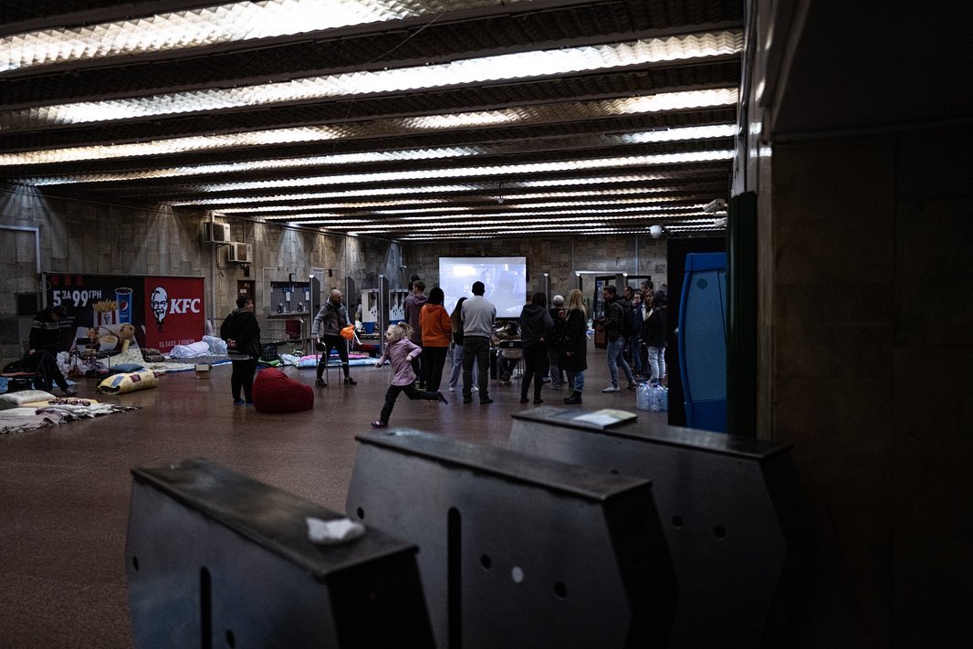 «На ст. м. Героев Днепра Оболонского района Киева до сих пор живут сотни людей, многие из них дети. Несмотря на отступление России, большинство опасается ответных атак со стороны России, а сирены воздушной тревоги все еще звучат по ночам. <...> На одной стороне станции был оборудован кинотеатр для детей, и во время нашего последнего визита я был удивлен, увидев, что фильмом вечера был… #notimetodie :)» (c)