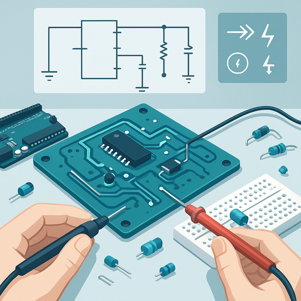 برای شروع، اول نمادهای پایه (Resistor, Capacitor, Diode, IC) و اتصالات بین آنها را شناسایی کن؛ بعد مسیرهای تغذیه (VCC, GND) و سیگنالها را دنبال کن. از یک مولتیمتر برای چک کردن continuity و اندازهگیری ولتاژها استفاده کن؛ در پروژههای ساده مثل کنترل LED با یک Arduino یا خواندن سنسور، همین روش کافی است. نقشهٔ پشت PCB را هم با شماتیک تطبیق بده تا لایهها و vias را بهتر بفهمی.
