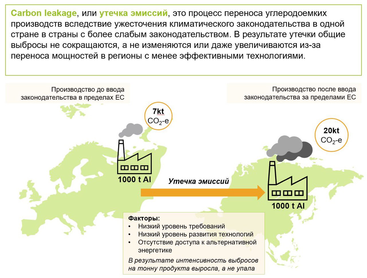 Утечка эмиссий - это процесс переноса углеродоемких производств из стран с сильным климатическим законодательством в страны с меньшими амбициями. Основная проблема утечки в том, что по итогу интенсивность выбросов на единицу продукции вырастает: во-первых, сам перенос мощностей вызывает дополнительную стройку и выбросы. Во-вторых, перенос чаще всего осуществляется по экономическим причинам и инвестировать в более эффективные технологии с меньшими выбросами производителям смысла не имеет. Дополнительно увеличивает общие выбросы и отсутствие доступной альтернативной энергетики в стране-реципиенте, а также растут выбросы поставщиков, если переходят на локальных (а у них средняя интенсивность тоже будет выше).