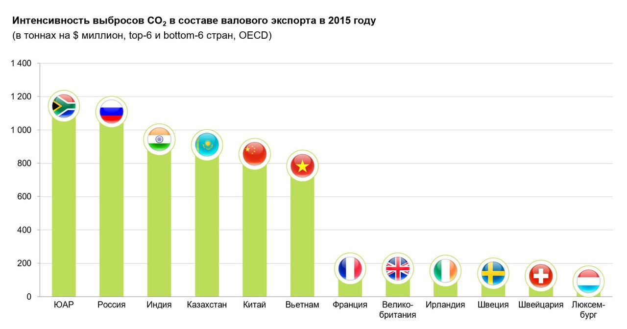 👉🏽 Россия, занимающая третье в мире место по объёму выбросов СО2 и четвёртое по интенсивности выбросов на доллар экспорта, не сможет оставаться конкурентоспособной на горизонте 3-5 лет, если все останется как сейчас.