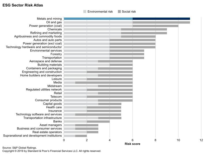 В отличие от кредитных рейтингов, ESG рейтинг будет сильно зависеть от рода деятельности компании. Это происходит, очевидно, из-за разного уровня ESG рисков для разных отраслей. Наиболее рисковыми считаются горно-металлургические и нефтегазовые компании. Наименее — банки, фонды, разработчики софта и компании в сфере услуг (в этом отчете подробное сравнение отраслей). Например, рейтинги лидеров в горнодобывающей отрасли сравнимы с худшими рейтингами среди страховых и компаний в секторе недвижимости.