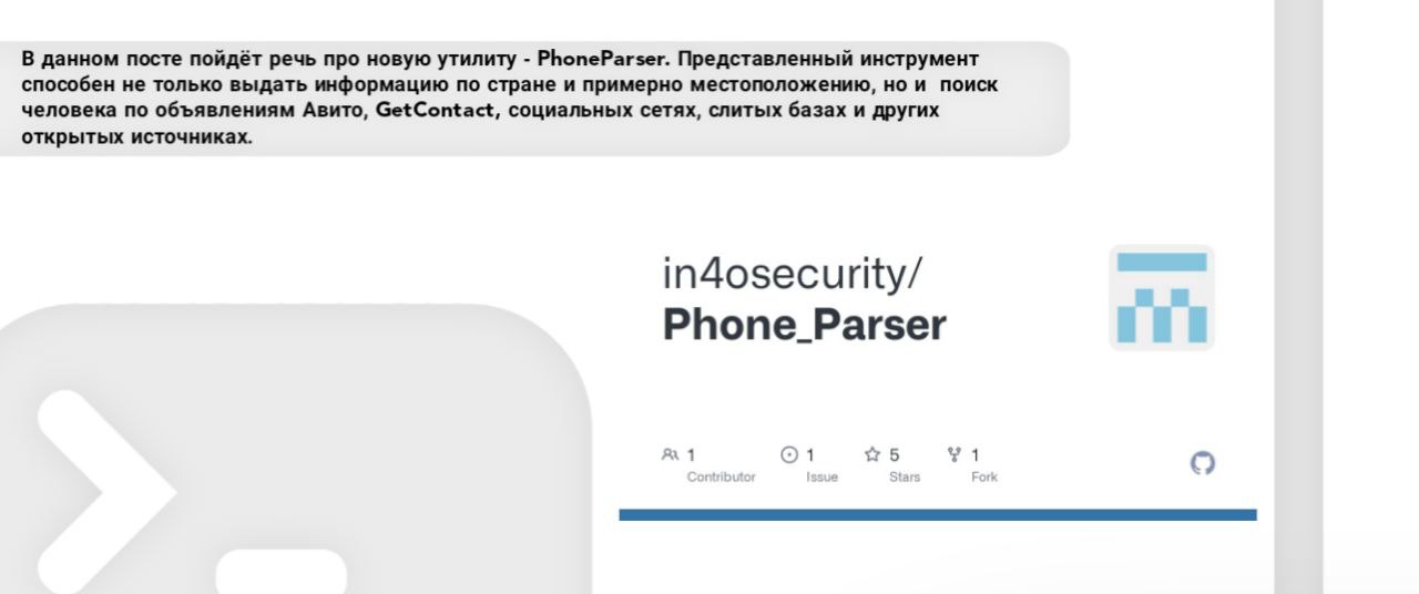 В данном посте пойдёт речь про новую утилиту - PhoneParser. Представленный инструмент способен не только выдать информацию по стране и примерно местоположению, но и поиск человека по объявлениям Авито, GetContact, социальных сетях, слитых базах и других открытых источниках.
