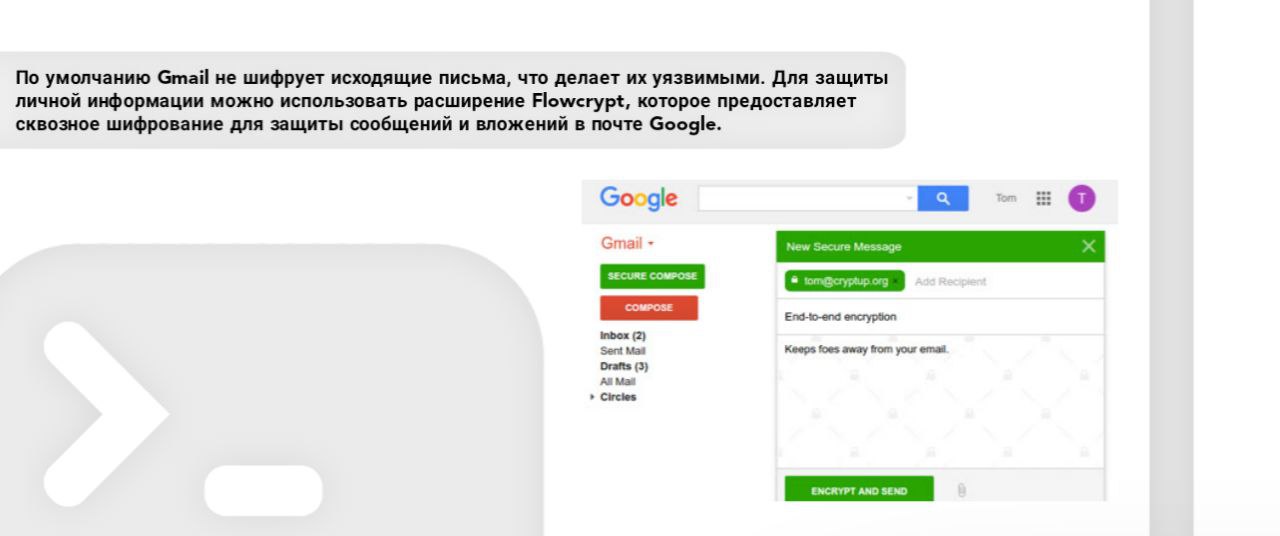 По умолчанию Gmail не шифрует исходящие письма, что делает их уязвимыми. Для защиты личной информации можно использовать расширение Flowcrypt, которое предоставляет сквозное шифрование для защиты сообщений и вложений в почте Google.
