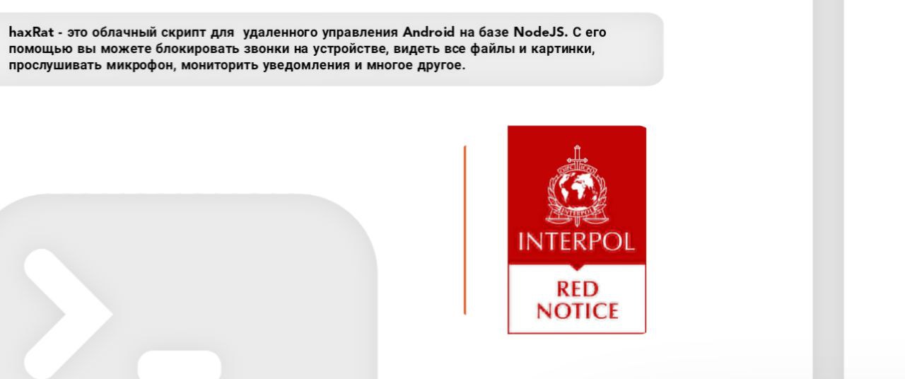 haxRat - это облачный скрипт для удаленного управления Android на базе NodeJS. С его помощью вы можете блокировать звонки на устройстве, видеть все файлы и картинки, прослушивать микрофон, мониторить уведомления и многое другое.