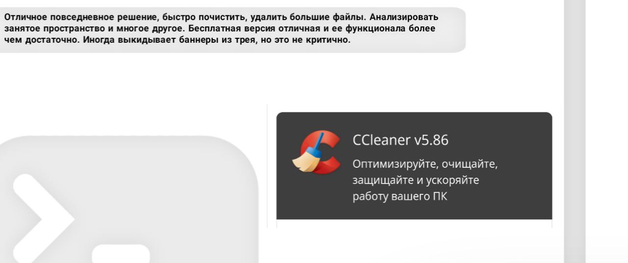 Отличное повседневное решение, быстро почистить, удалить большие файлы. Анализировать занятое пространство и многое другое. Бесплатная версия отличная и ее функционала более чем достаточно. Иногда выкидывает баннеры из трея, но это не критично.
