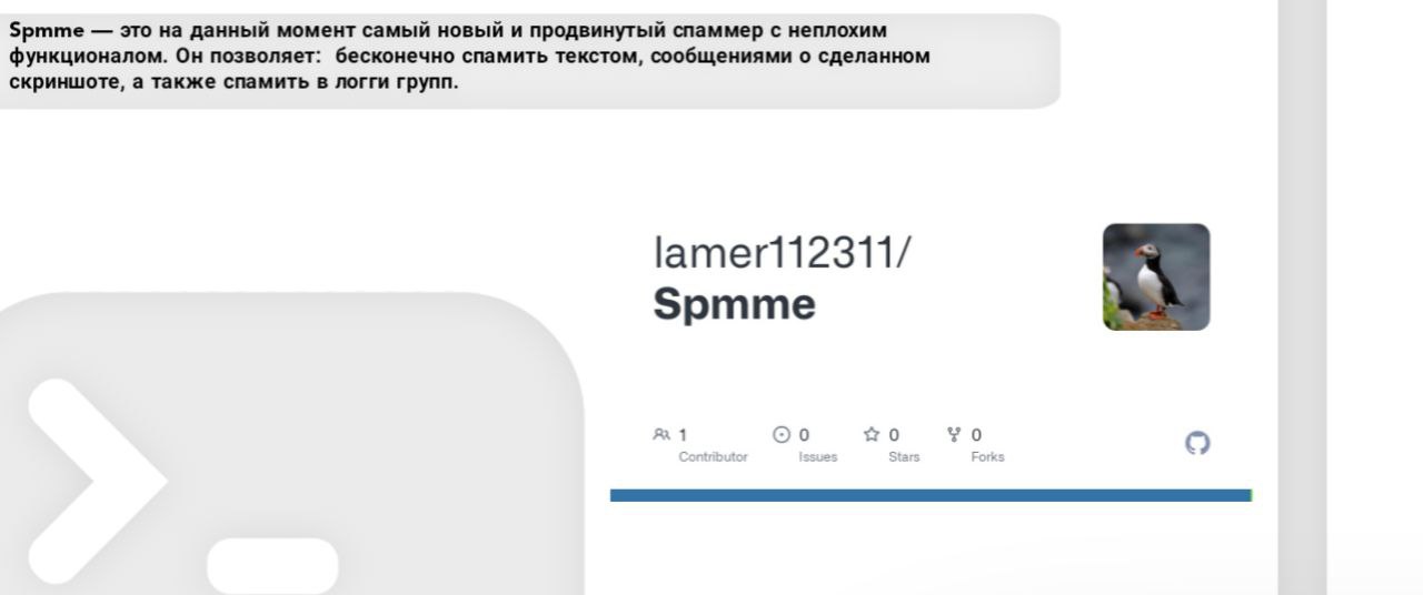Spmme — это на данный момент самый новый и продвинутый спаммер с неплохим функционалом. Он позволяет: бесконечно спамить текстом, сообщениями о сделанном скриншоте, а также спамить в логги групп. Работает как на Termux так и на Windows.
