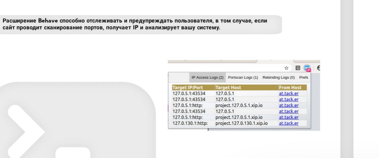 Расширение Behave способно отслеживать и предупреждать пользователя, в том случае, если сайт проводит сканирование портов, получает IP и анализирует вашу систему.