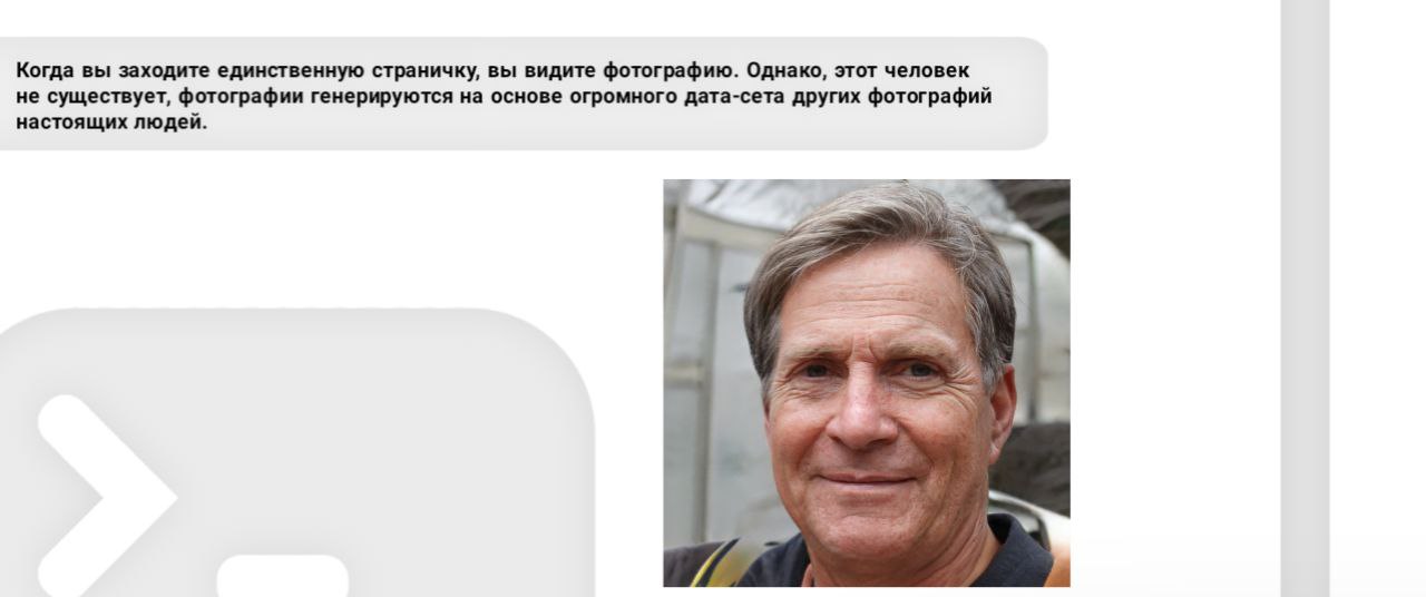 Когда вы заходите единственную страничку, вы видите фотографию. Однако, этот человек не существует, фотографии генерируются на основе огромного дата-сета других фотографий настоящих людей.