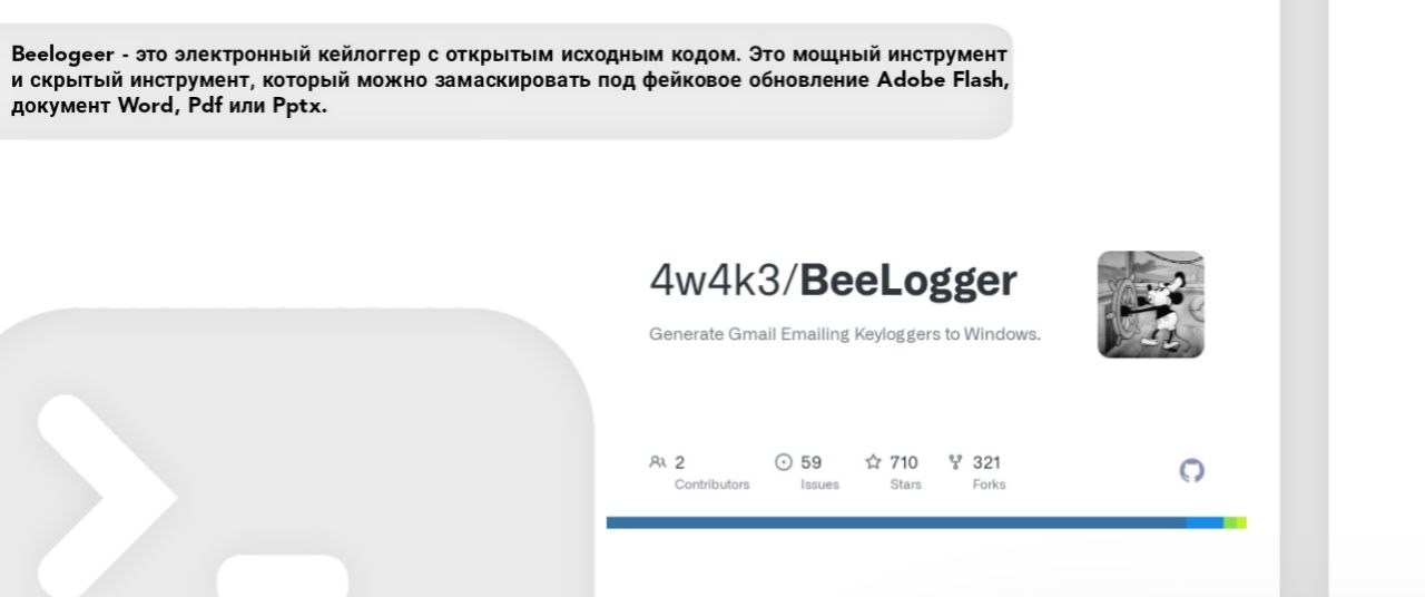 Beelogeer - это электронный кейлоггер с открытым исходным кодом. Это мощный инструмент и скрытый инструмент, который можно замаскировать под фейковое обновление Adobe Flash, документ Word, Pdf или Pptx.