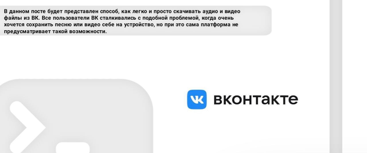 В данном посте будет представлен способ, как легко и просто скачивать аудио и видео файлы из ВК. Все пользователи ВК сталкивались с подобной проблемой, когда очень хочется сохранить песню или видео себе на устройство, но при это сама платформа не предусматривает такой возможности.