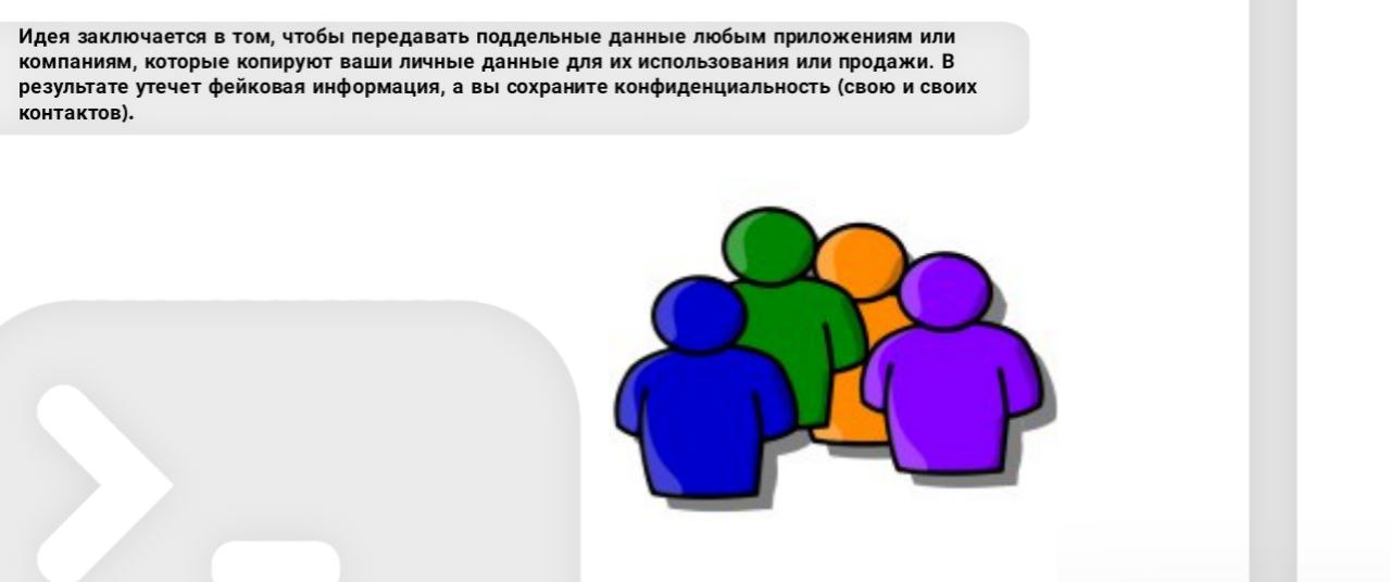 Идея заключается в том, чтобы передавать поддельные данные любым приложениям или компаниям, которые копируют ваши личные данные для их использования или продажи. В результате утечет фейковая информация, а вы сохраните конфиденциальность (свою и своих контактов).