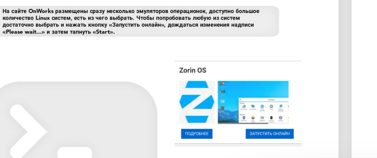 И если в онлайн-эмуляторе с такими различиями в полной мере не познакомиться, то оценить внешний вид, интерфейс и внутреннее устройство возможно. На сайте OnWorks размещены сразу несколько эмуляторов операционок, доступно большое количество Linux систем, есть из чего выбрать.