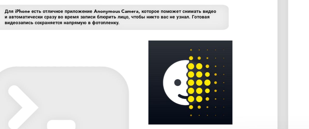 Для iPhone есть отличное приложение Anonymous Camera, которое поможет снимать видео и автоматически сразу во время записи блюрить лицо, чтобы никто вас не узнал. Готовая видеозапись сохраняется напрямую в фотопленку.