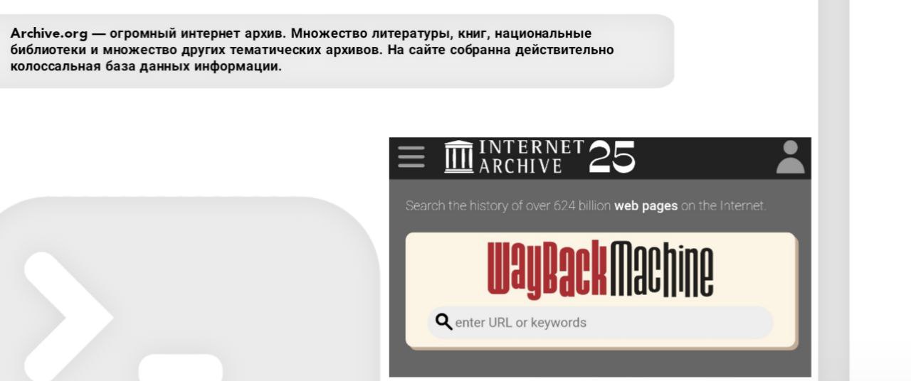 Archive.org — огромный интернет архив. Множество литературы, книг, национальные библиотеки и множество других тематических архивов. На сайте собранна действительно колоссальная база данных информации.
