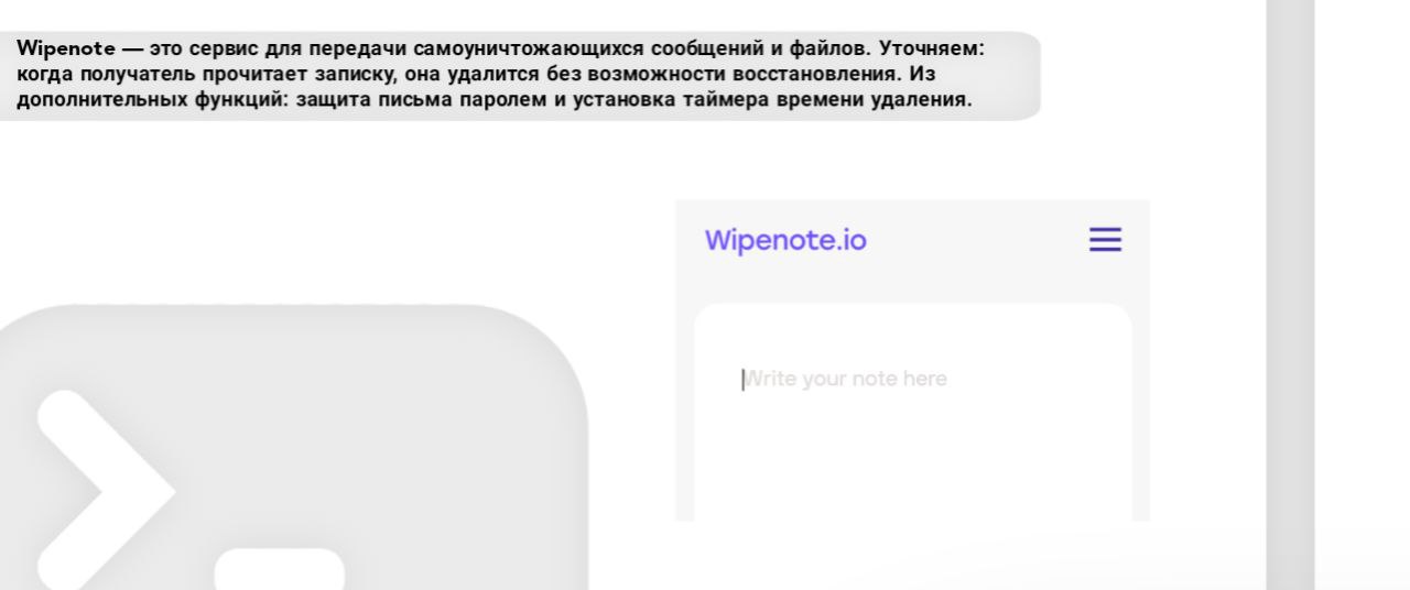 Wipenote — это сервис для передачи самоуничтожающихся сообщений и файлов. Уточняем: когда получатель прочитает записку, она удалится без возможности восстановления. Из дополнительных функций: защита письма паролем и установка таймера времени удаления.