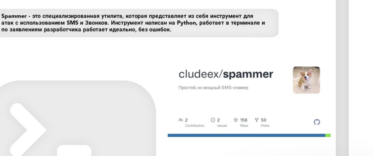 Spammer - это специализированная утилита, которая представляет из себя инструмент для атак с использованием SMS и Звонков. Инструмент написан на Python, работает в терминале и по заявлениям разработчика работает идеально, без ошибок.