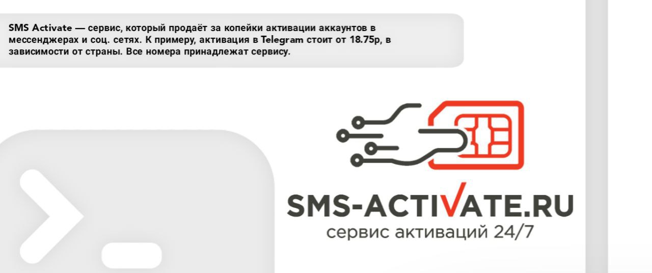 SMS Activate — сервис, который продаёт за копейки активации аккаунтов в мессенджерах и соц. сетях. К примеру, активация в Telegram стоит от 18.75р, в зависимости от страны. Все номера принадлежат сервису.