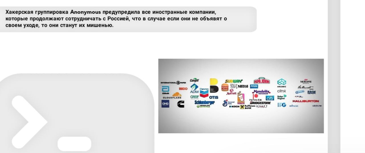 Хакерская группировка Anonymous предупредила все иностранные компании, которые продолжают сотрудничать с Россией, что в случае если они не объявят о своем уходе, то они станут их мишенью.