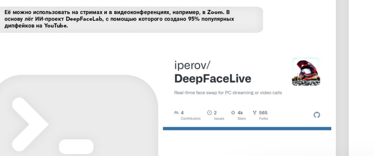 Её можно использовать на стримах и в видеоконференциях, например, в Zoom. В основу лёг ИИ-проект DeepFaceLab, с помощью которого создано 95% популярных дипфейков на YouTube.