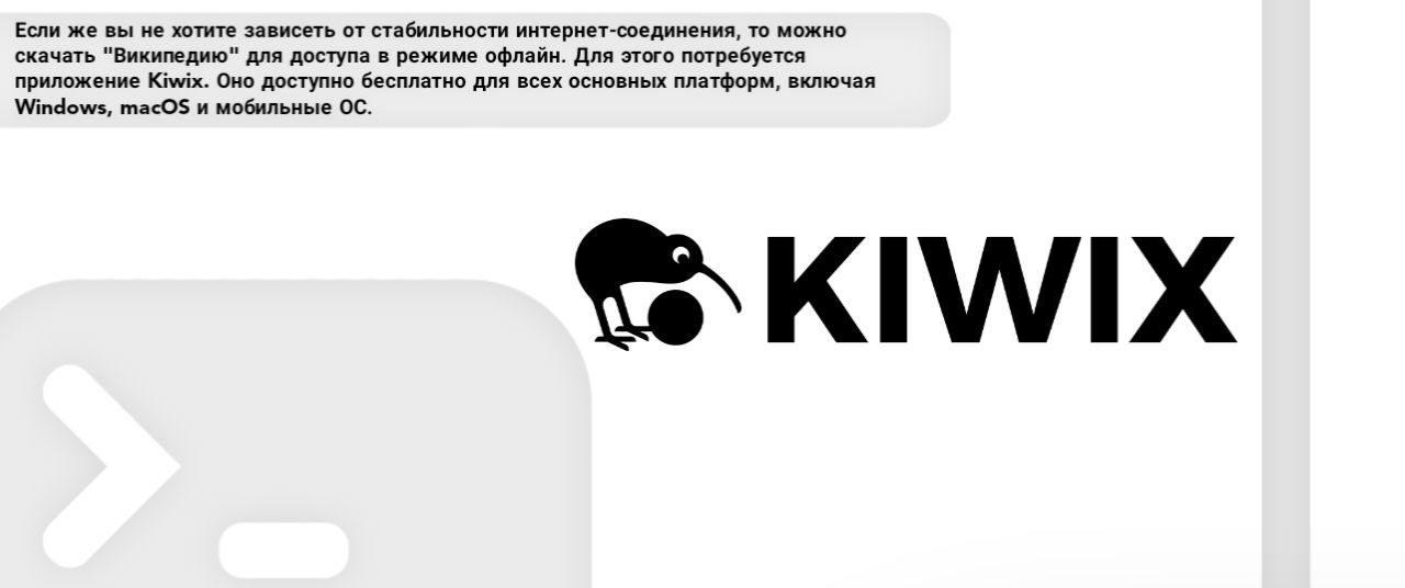 Если же вы не хотите зависеть от стабильности интернет-соединения, то можно скачать "Википедию" для доступа в режиме офлайн. Для этого потребуется приложение Kiwix. Оно доступно бесплатно для всех основных платформ, включая Windows, macOS и мобильные ОС.