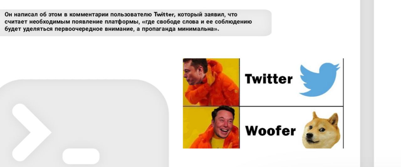 Он написал об этом в комментарии пользователю Twitter, который заявил, что считает необходимым появление платформы, «где свободе слова и ее соблюдению будет уделяться первоочередное внимание, а пропаганда минимальна».