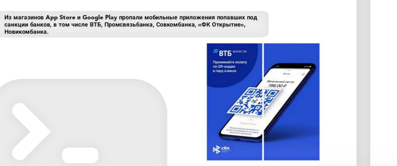 Из магазинов App Store и Google Play пропали мобильные приложения попавших под санкции банков, в том числе ВТБ, Промсвязьбанка, Совкомбанка, «ФК Открытие», Новикомбанка.