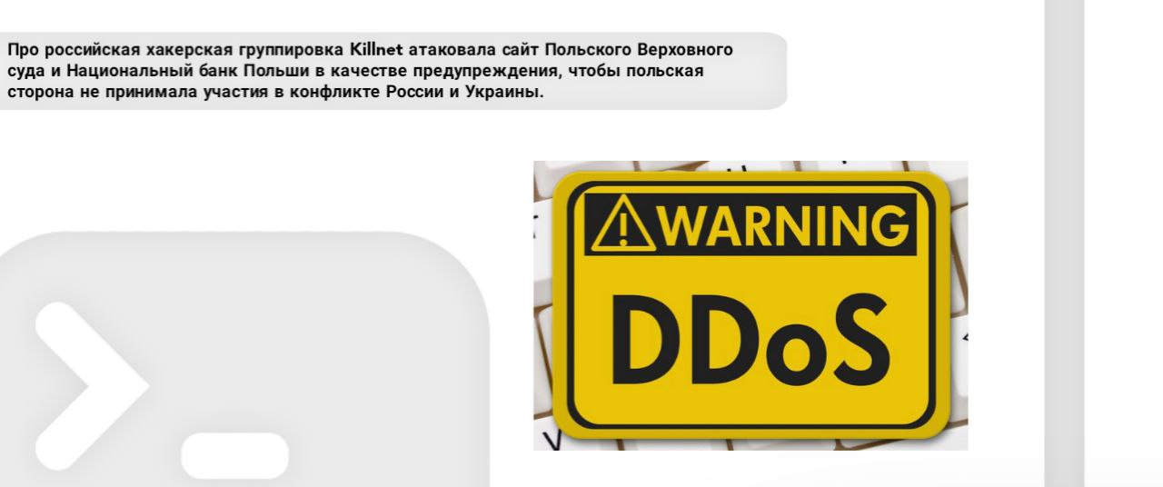 Про Российская хакерская группировка Killnet атаковала сайт Польского Верховного суда и Национальный банк Польши в качестве предупреждения, чтобы польская сторона не принимала участия в конфликте России и Украины.