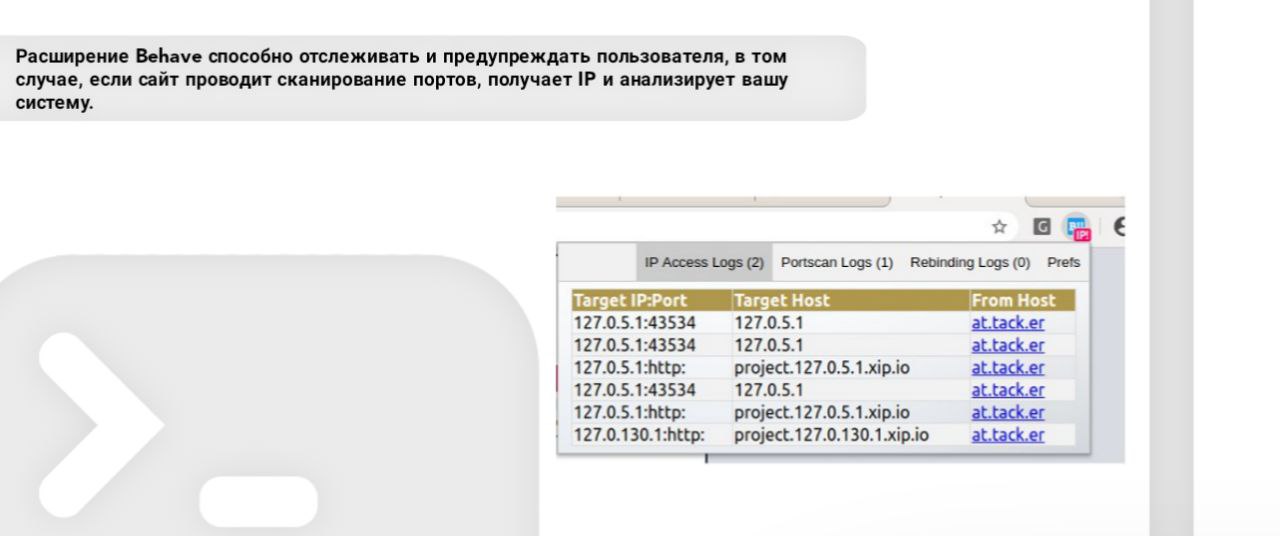 Расширение Behave способно отслеживать и предупреждать пользователя, в том случае, если сайт проводит сканирование портов, получает IP и анализирует вашу систему.