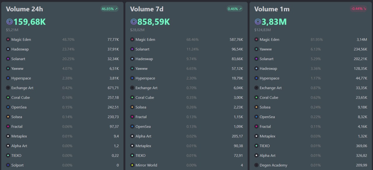 За последние несколько месяцев Magic Eden потеряли практически половину объемов рынка. Если в сентябре через ME в среднем в день совершалось чуть более 80% всех сделок с NFT на Solana, то неделю назад 70%, а сегодня 52%. Более подробные данные изображены на приложенном скриншоте. (Источник информации: Tiexo).
