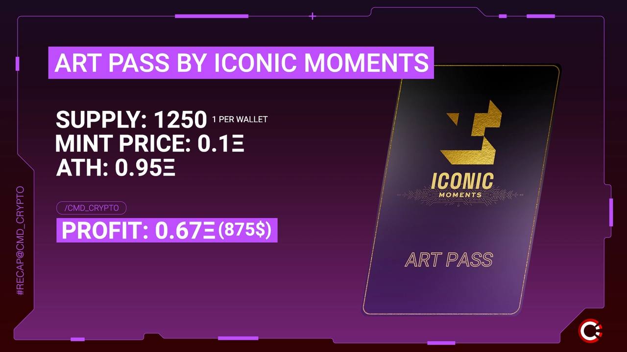 Очередной паблик на эфире, который наши мемберы вынесли вперёд ногами — Art Pass by Iconic Moments. Сток для публичной продажи был всего 624 NFT, однако, чтобы иметь возможность их приобрести, необходимо было зарегистрировать преминт, о котором мы писали еще в момент его открытия. Учитывая, что у многих участников прошло более 50% аккантов в преминте, вкупе с бесплатными слотами на дроп от наших модераторов, все, кто не ленился, получил отличный профит в тысячи долларов. Однако, если у вас не было множества прогретых кошельков и твиттер-аккаунтов, то даже с одной выигрышной регистрацией можно было заработать порядка 875$ чистыми.