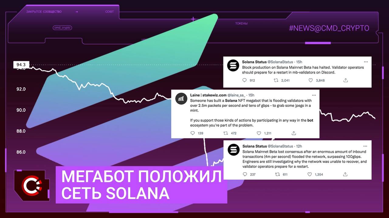 По заявлению представителя Stakewiz, оператора валидаторов в сети Солана, кто-то создал "мегабота", отправлявшего в сеть более 2.5 миллионов пакетов и десятки гигабитов в секунду. В Solana Status заявили, что нагрузка была еще большей и составила 4 миллиона входящих транзакций в секунду со скоростью порядка 100 гигабит в секунду.