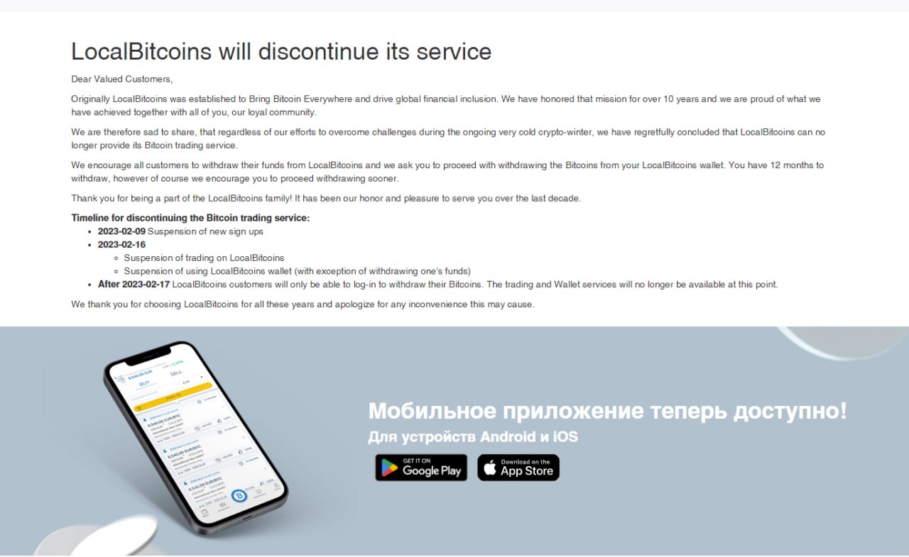 Некогда популярный крипто-обменник Localbitcoins сообщил об ограничении новых регистраций на своём сайте с сегодняшнего дня, а также о полном прекращении деятельности с 16 февраля.