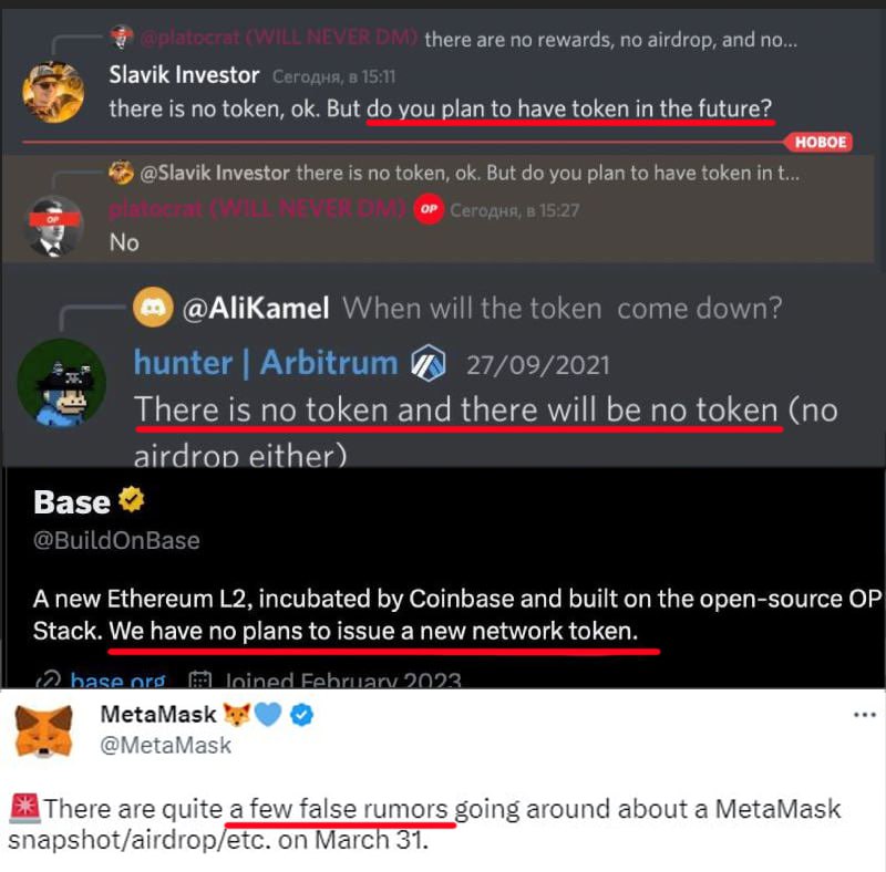 Официальный аккаунт MetaMask наконец-то выступил с заявлением: «всё фейк, вокруг скамеры, 31 марта ничего не будет». На что сразу же им посыпались ответы: «ага, значит не 31-го, а после» или «уже сделали снепшот, все ясно». Всё из-за формулировки твита, в котором конкретно не сказано, что аирдропа не будет, а лишь указано на то, что 31-го ждать ничего не стоит.