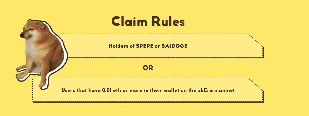 Очередной щиток $CHEEMS раздаёт деньги. В этот раз на ZkSync Era и только для тех, кто холдит AiDoge, Pepe или 0.01 ETH.