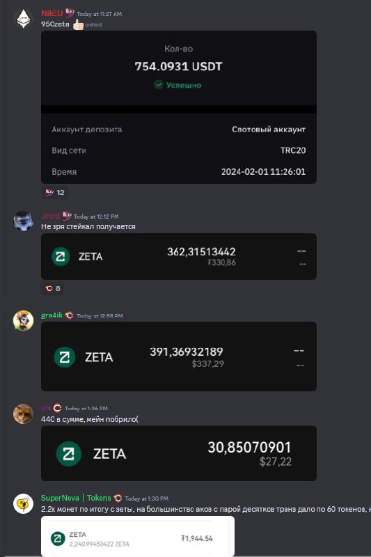На нашем Discord-сервере, помимо того, что мы 1.5 года освещали активности в Zeta Chain, запостили акцию от OKX — даже если вы не eligible, но у вас есть от 0.3 BTC (12,650$), то за вклад в майнинг пул на сутки ежеминутно начисляли токены. Чем быстрее положили, тем больше получили. В среднем вышло по 400 ZETA (350$).