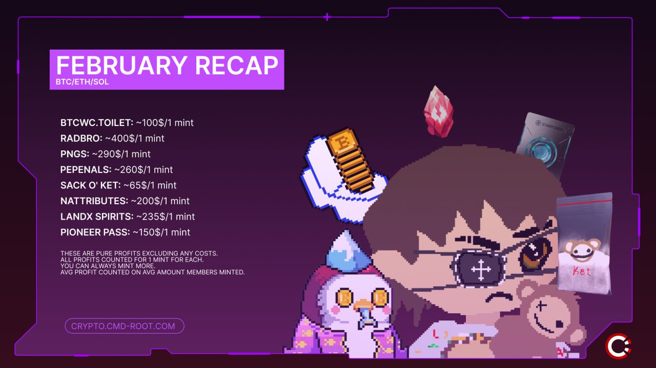 Бычка уже здесь и Февраль прямое тому подтверждение — достигнут близкий к ATH уровень по BTC, альты постепенно догоняют, а количество минтов и выходящих проектов не оставляет без профита любого, кто находится в правильном инфополе и готов работать.