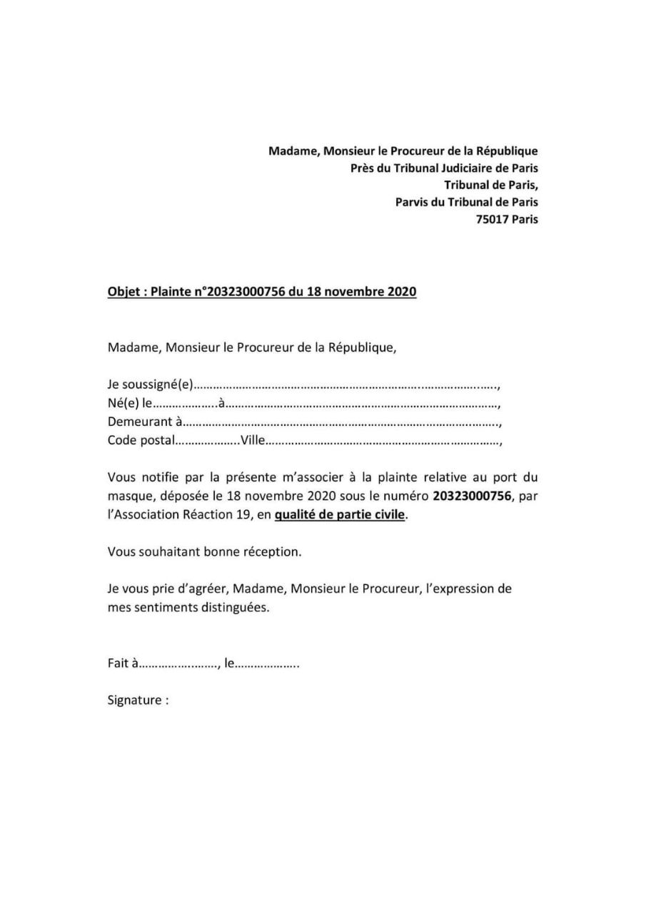 Pensez à compléter le formulaire sur le site REACTION19 pour leur indiquer que vous avez envoyé votre lettre pour vous joindre à la plainte.