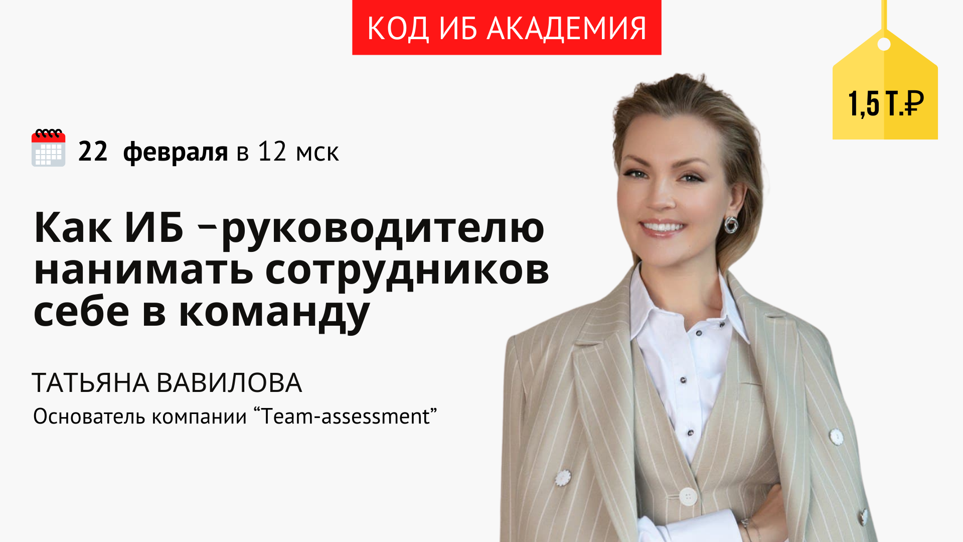▫️ 22.02 вт | 12:00 мск | Мастер-класс в Код ИБ Академии c Татьяной Вавиловой | Как ИБ-руководителю нанимать сотрудников к себе в команду? | Программа и регистрация