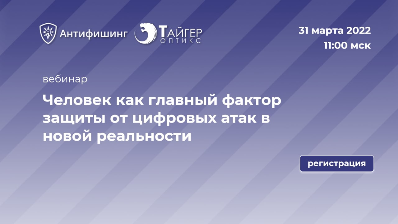 Вебинар компаний Антифишинг и Тайгер Оптикс, на котором мы расскажем о последнем исследовании в области защищенности сотрудников от цифровых атак, сделанном на основе обезличенных данных по 40 000 имитированных атак на 20 000 сотрудников из 37 организаций в 2021 году