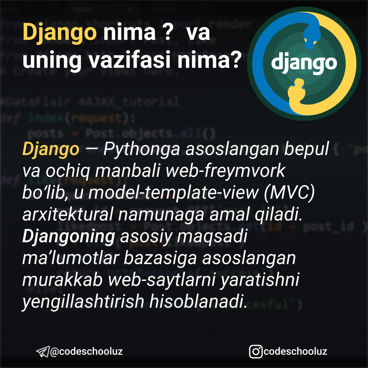 💡Django — Pythonga asoslangan bepul va ochiq manbali web-freymvork boʻlib, u model-template-view (MVC) arxitektural namunaga amal qiladi. Uni Django Software Foundation (DSF), nodavlat tashkilot sifatida tashkil etilgan Amerika mustaqil tashkiloti qoʻllab-quvvatlaydi. Djangoning asosiy maqsadi maʼlumotlar bazasiga asoslangan murakkab web-saytlarni yaratishni yengillashtirish hisoblanadi.
